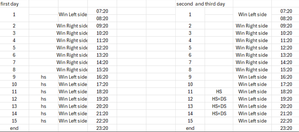 Start 7:20 - End 23:20 (game time)